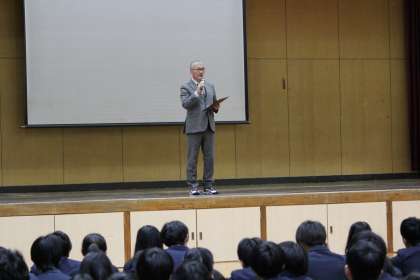 表彰後、終業式を行いました。「ニ学期は、応援団の結成や学校行事の全校実施など、新たなことにチャレンジできた学期でした。…インフルエンザが猛威をふるっているので、体調管理をしっかり行うとともに、SNSの使い方に十分注意してください。…3年生の皆さんは悔いの残らないよう学習に励み、1,2年生の皆さんは、『なりたい自分』『ありたい自分』について考えてください。」と、校長先生から話がありました。片山先生より「そうぞう力」の大切さの話がありました。「言われたことをやるだけの人間にならないように。なりたい自分を想像し、創造していくことが、人として大切なことです。」という内容でした。