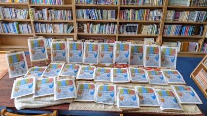 今週から開館がスタートした図書館の一角に、華やかな表紙をつけた袋が並んでいます。その名も『福BOOK(ろ)』。本の福袋です。図書委員会のメンバーが、選書と袋詰めを行いました。中身の本の手がかりとなるヒント文も、図書委員がそれぞれ考案したものです。