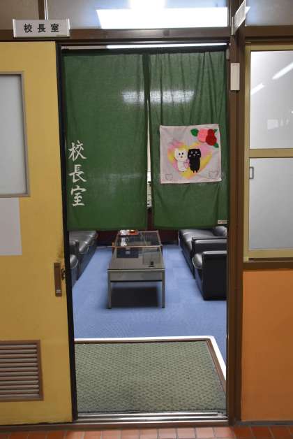 校長室の入口には,家庭科部の皆さんにつくってもらった暖簾が掛かっています。図柄の部分は,月毎に取替えられるようになっています。