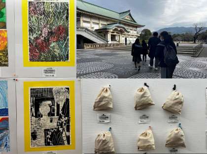 京都市京セラ美術館で開催される「第46回小さな巨匠展」へ、出品者の10組メンバーが、ひと足早く、鑑賞に出かけました。美術館に入ると、たくさんの展示作品の中、自分たちの作品を見つけ、とても喜んでいます。他校の作品も立派で、「これ、すごいや」「来年作りたい」など、意欲的な言葉の数々。特に、小学生の作品に圧倒されたようです。「小さな巨匠展」は2月3日〜4日に開催です。
