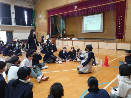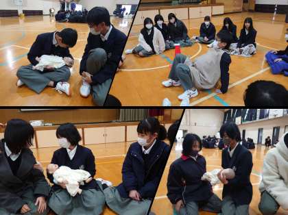 講演後、赤ちゃん人形のだっこと、グループ内で1名ずつ、妊婦体験をしました。赤ちゃん人形は、重さが実際の新生児と同じくらいあり、首もすわってないので、予想以上に苦戦していたようです。普段できない貴重な学習ができました。