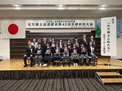 2月10日(土)午後、京都ガーデンパレスで、第18回「北方領土と私たち」作文コンクール表彰式が行われ、本校2年生徒が表彰されました。令和4年夏に参加した「北方領土青少年現地視察事業」をきっかけに、北方領土問題解決に向けての考えをまとめた作文で、タイトルは「僕が考える北方領土問題」です。この作文において、「府民会議会長賞」を受賞しました。