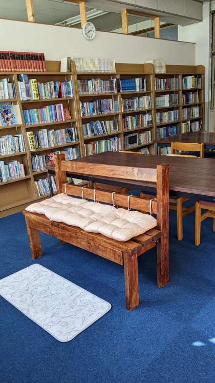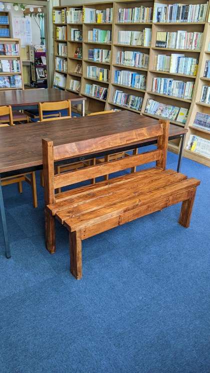 10組のメンバーが技術の時間に制作した「木製ベンチ」が、このたび図書館に設置されることになりました。中学生はもちろん、大人3人が座れる頑丈な作りながら、木の風合いを生かした塗装も施されており、手作りの良さや温もりが伝わってきます。放課後には、早速ベンチに座って本を読む人の姿も…。音中図書館に誕生した素敵なスペースで、素敵な読書タイムを過ごしてくださいね。