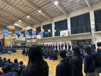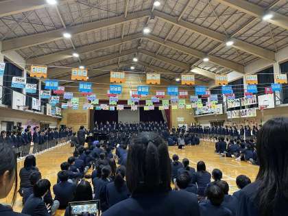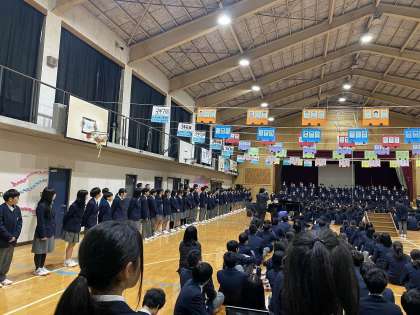1年生の発表です。舞台上と体育館の周りを囲むように並んだ1年生の発表は、歌・ダンス・群読が組み合わさって、「次に何が出てくるんだろう」とわくわくする発表でした。