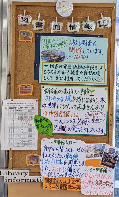 昼休みはもちろん、ぜひ放課後にも、音中図書館へ気軽に足を運んでくださいね。皆さんの来館をお待ちしています。