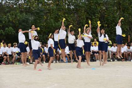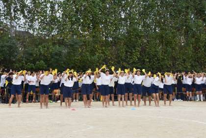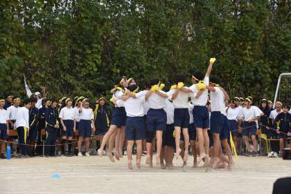 午後は各色の応援パフォーマンスから始まりました。それぞれが趣向を凝らした応援を繰り広げました。そのあとは各学年の学年種目と色別対抗リレーが行われました。午前の部終了時点では赤組が優勢でした。巻き返しを狙う青組と黄組が猛追しましたが、最後は赤組が逃げ切りました。