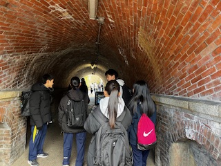 南禅寺の周辺にも本校の生徒がたくさん散策しています。インクラインの下をくぐる「ねじりまんぽ」は有名ですね。入ってみると螺旋状に並べられたレンガが美しい、珍しい工法で作られていることがわかります。