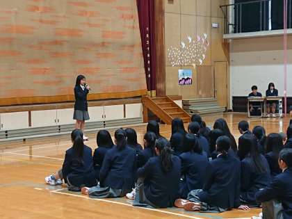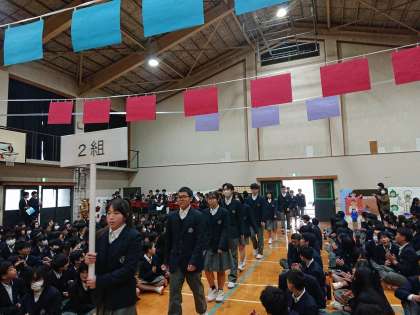 本日は、生徒が企画する卒業式ともいうべき「3年生を送る会」が実施されました。吹奏楽部の演奏で入場し、生徒会のオープニングに続き、生徒会長からあいさつがありました。、