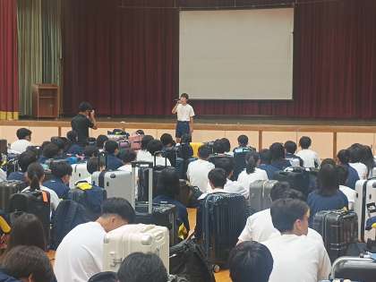 3年生の学年団は一人も欠けることなく時間通りに集合し、結団式と執り行いました。これから始まる修学旅行に多くの学びと団結があらんことを!
