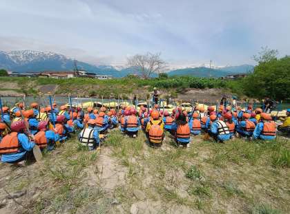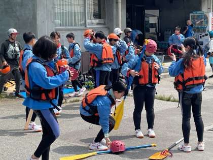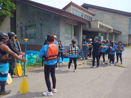 野外体験が始まっています。ラフティングをするグループは着替えて諸注意を受けました。