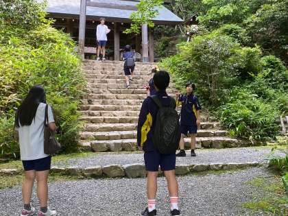 3年生は修学旅行の真っ最中ですが、1年生も総合的な学習の時間の一環で、校外でフィールドワークを行っています。山科の魅力を発信するCM作りのため、班別に様々な場所で調査を行っています。写真は、「京の伊勢」とも呼ばれる日向大神宮ですね。外宮と内宮に分かれていて、天岩戸もあるんですよ。