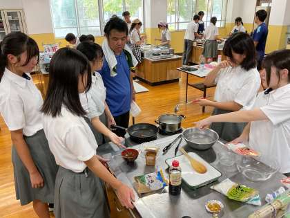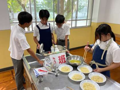 今年度より、音羽中学校では総合的な学習の時間を使って地域を題材にしたラボ活動を行っています。先日、3年生の防災ラボは避難所での調理を想定した実習を行いました。食材は保存がきくものを中心として選び栄養バランスも考えながら取り組みました。グルメラボは地元の食材を使ったスイーツを考えたり、過去にあった名物スイーツの再現にチャレンジしました。