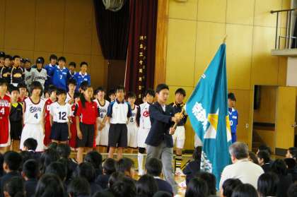 春季大会に出場する各部活動の選手がユニフォームを着て入場し、各キャプテンが春季大会へ向けての抱負を発表しました。