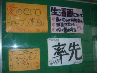 掲示板は、生徒会本部作成のもの。「率先」いいですね。