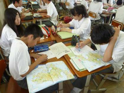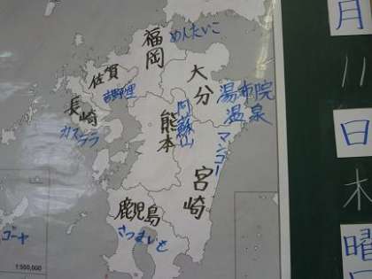 社会科の授業です。小グループに分かれて九州の学習をしています。