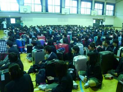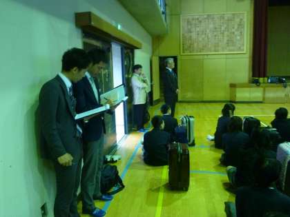 朝早くから体育館に集まり(生徒6:30、左の業者さんは5時過ぎ)、いざ出発!