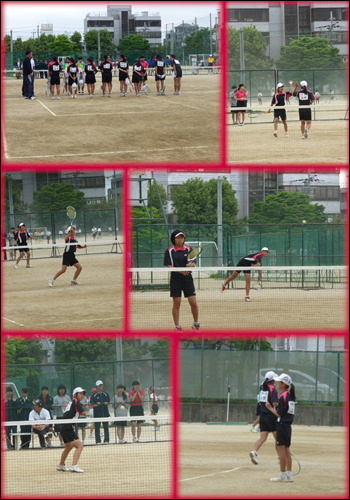 ソフトテニスの初戦は,産業大学附属中学校でした。試合前は,少し緊張しているように感じましたが,試合に入ると見事3−0で快勝しました。続く桃山中学校戦も勢いよく快勝しました。応援している側も思わず力が入りました。続いての下京中学校戦は,2ペアともファイナルゲームまでもつれ込みましたが,惜敗しました。なかなか見応えのあるゲームで,夏季大会につながっていく良い戦いぶりでした。