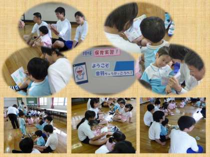 最初に歌を聞かせてもらい,手作りの絵本を膝の上で読み聞かせ?をしました。最初は恥ずかしそうな様子でしたが,手作りの本を一生懸命見てくれました。そして,体育館へ・・・その頃には手をつないで仲良しになっていました。