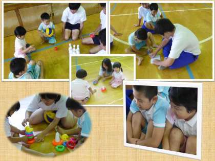 体育館では,ボール遊びをしたり,輪投げをしたり,ボーリングをしたり,折り紙をして交流しました。難しい折り方でしたが,ハートが出来たときの女の子達の嬉しそうな顔が印象的でした。