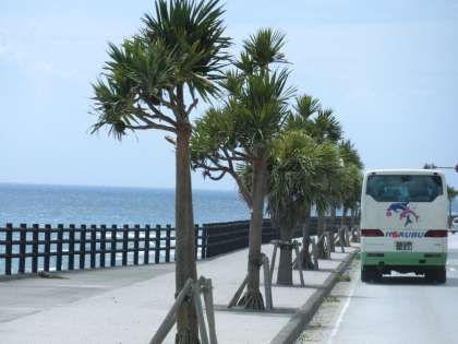 青い海、青い空を見ながら、「美ら海水族館」に向けて移動中です。14:45頃に到着の予定です。順調に行程が進んでいます。