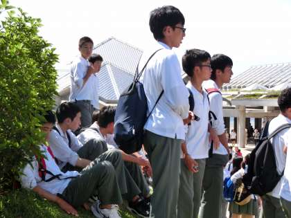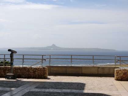 美ら海水族館から伊江島が見えます。美ら海水族館を後にして、伊江島に船で渡るため、本部港に向かいます。伊江島の伊江港に17:30に到着の予定です