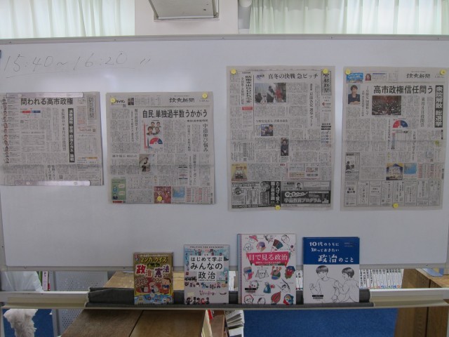 今年度も残すところ2ヶ月となりましたね。3年生も受験本番!!図書館でも面接指導が行われており、「頑張れ!!」と心から応援しています!忙しい時期にも関わらず、本を借りに来てくれる生徒もいて、読書が受験勉強の息抜きになっているのかな?と思う今日この頃です☆図書館内のホワイトボードには、気になる新聞記事と関連本を一緒に展示しています。ちょっと立ち止まって、社会の動向を知り、知識を得ることで視野を広げてみましょう。