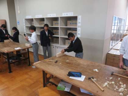 木工室では1年生の技術で本立ての製作です。