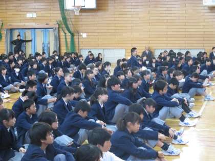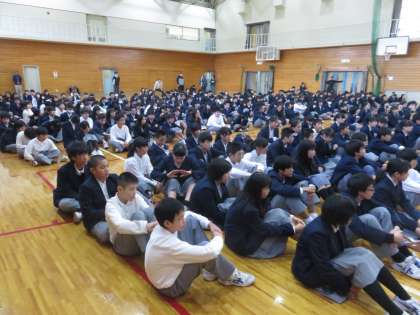 旧生徒会長から新生徒会長へ生徒会器の引き渡しです。