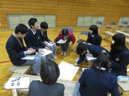 全校生徒を45グループの縦割りに分け(収穫祭のグループをベース),異年齢による道徳のグループ討議です