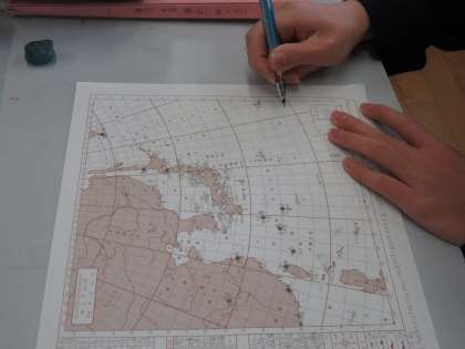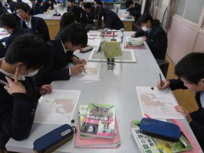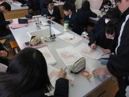 理科室では2年生が天気図を使って気象の学習です。