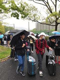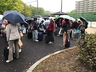 すこし眠そうですが、大きな荷物を持って集合しています。