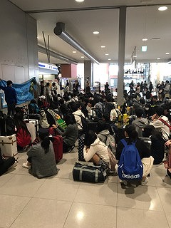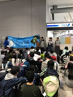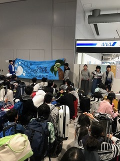 出発式。空港内の広さに驚いている人もいるかなあ?