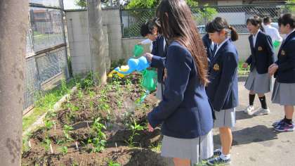 じょうろで細かな水をたっぷり与えました。苗植え・水やりの作業をみんなで協力し、スムーズに終えることができました。健康な植物を育てるには、適度な水分や栄養を保ち、通気性の良い土が必要とされるそうです。