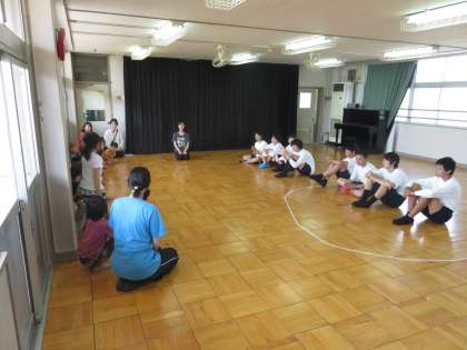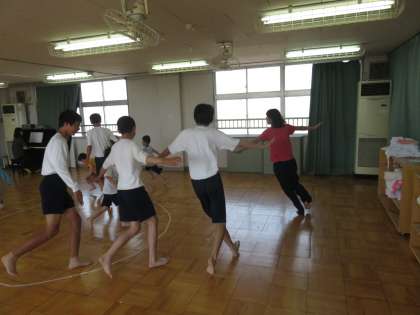 園庭やホールで園児と生徒が一緒に遊びます。40分程度の短い交流ですが,最後はすっかりなんじんでいました。