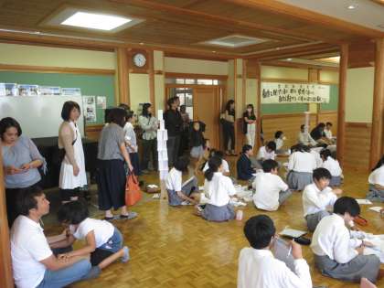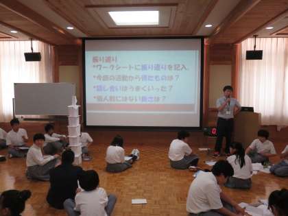 1年生は多目的室にて「ペーパータワー」をつくりあげる工程での協力やコミュニケーションの大切さを学びます。