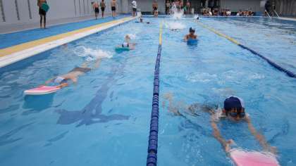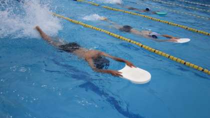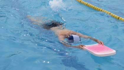 まずは水に慣れ、ビート板を使って「けのび」の練習をします。水泳学習において、楽に・速く・長く泳ぐための重要な動作です。