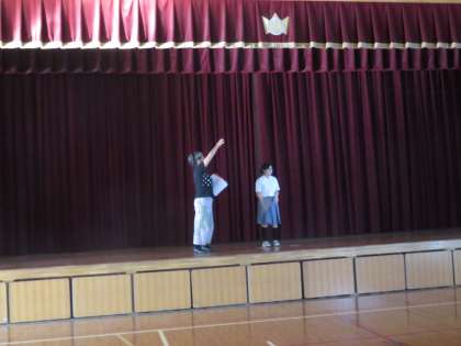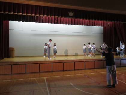 1年学年劇「ロミオとジュリエット」の舞台稽古です。監督の櫻井先生から指示がとんでいます。