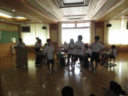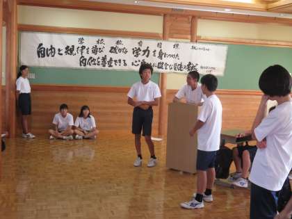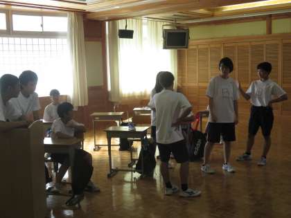 2年学年劇「KIZUNA」です。多目的室にて通しの稽古が行われていました。台詞はほぼ覚えているようです。