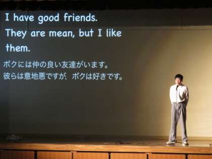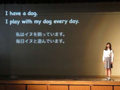 この取組も4年目をむかえました。日頃の英語の授業の成果を発表する場ですが,夏休み明けに各学年とも全員を対象に暗唱をおこない,代表者を決定しています。