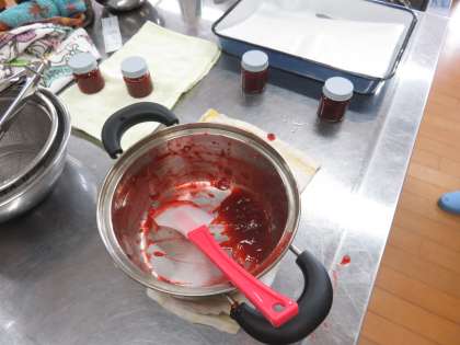 出来上がったイチゴジャムを瓶につめていきます。瓶にはラベルも貼っていきます。