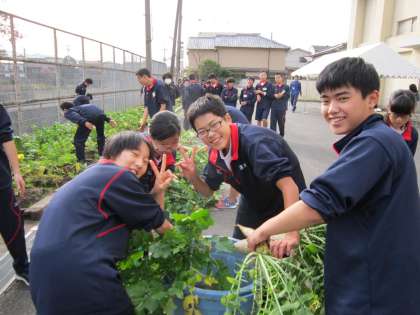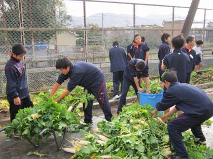 収穫祭で鍋に入れるために、大根を収穫します。