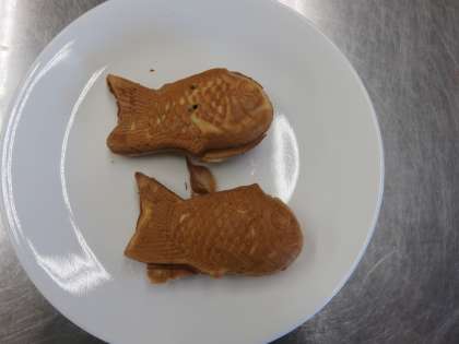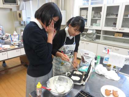 放課後,調理室で家庭科部がワッフルを焼いていました。たい焼き風のワッフルでチョコレートクリームが入っているそうです。