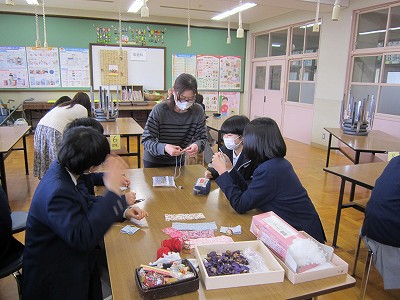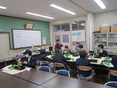 華道では、「生きる」をテーマに花を生けました。書道では、孔雀の羽根・イタチの毛の筆を使って様々な文字を表現しました。