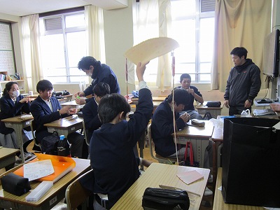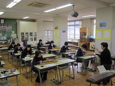 大正琴では、さくらの曲に合わせて指の使い方を学びました。京扇子は、自分で絵を描き「オリジナル扇子」が完成しました。タップダンスでは基本ステップの練習からリズムをとり踊りました。地域の方々に協力していただき、充実した花山中学校の伝統文化体験授業となりました。