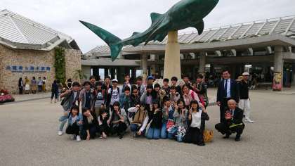 好天に恵まれています。水族館内には水量7,500m3の世界最大級の大水槽『黒潮の海』が設置されています。全員元気にクラス写真です。