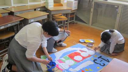 昨日の放課後から、各クラスで工夫して制作する姿が見られています。大きな旗ですが、既に下書きを終えて、絵の具で色を塗り始めているクラスもありました。この学級旗は、今後の学校行事などで掲げて、行事を盛り上げることになります。