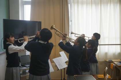吹奏楽部の今日の活動風景です。各パートに別れて、楽器の演奏の練習をしていました。2・3年生の先輩が1年生の部員に教えている場面も見られました。今日も、家庭訪問期間中で、放課後のクラブ活動の時間がいつもより長かったですが、頑張って活動していました。
