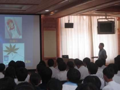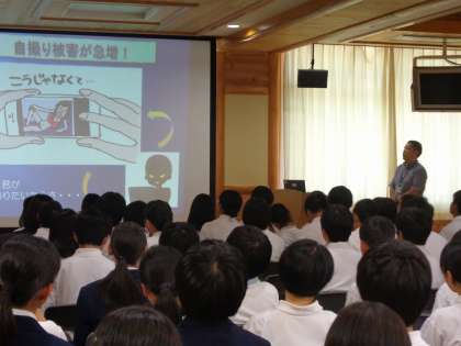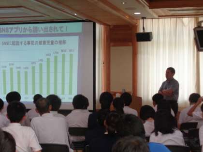 6時間目、2年生は「非行防止教室」を行いました。教育委員会生徒指導課 問題行動対策担当課長の現役の警察官の方より、多目的室で話を聴きました。主にSNSや様々な犯罪についての話で、実際に起きている事例も交えて、気を付けるべきことについて話していただきました。SNSは便利なものですが、使い方を間違えないように、しっかり考えていきたいものです。