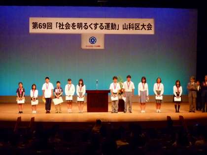 7月14日に東部文化会館にて、第69回「社会を明るくする運動」山科区大会が多数の関係者や地域の皆様の参加のもと盛大に開催されました。本年度のテーマを「犯罪や非行を防止し,立ち直りを支える地域のチカラ」とし、犯罪や非行をした人の立ち直りや社会参画、見守りの必要性を第一部式典の中で述べられていました。第二部では、山科区の小中高校生の代表が様々なテーマについて作文発表を行いました。本校からは、3年生のS・Aさんが「SNSの可能性 つながっているということ」と題し、SNSの使い方や考え方一つで社会のため人のために貢献できることもあるという内容で自身の経験から感じた事をわかりやすく,丁寧に思いを込めて発表しました。地域・保護者等、多数の方々からお褒めの言葉をいただきました。本当に素晴らしい発表でした。