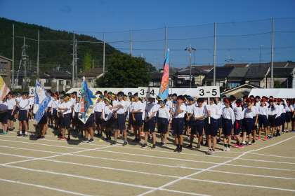 本日、「学校祭 体育の部」が実施されました。朝から晴天の中、開会式を行うことができました。開会式では、開会宣言、選手宣誓、ウォーミングアップダンスなどが行われました。プラカードや学級旗を持った体育委員の生徒を先頭に全校生徒が整列して、集中している姿は素晴らしかったです!